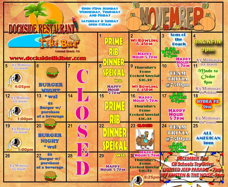 - Seasonal opening of Dockside's outdoor Tiki Bar with live music